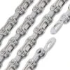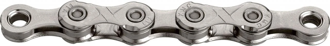 La cadena súper ligera X11R de 11 velocidades de KMC sin dependencia del sentido de la marcha y con placas exteriores niqueladas para sistemas de cambio de 11 velocidades.