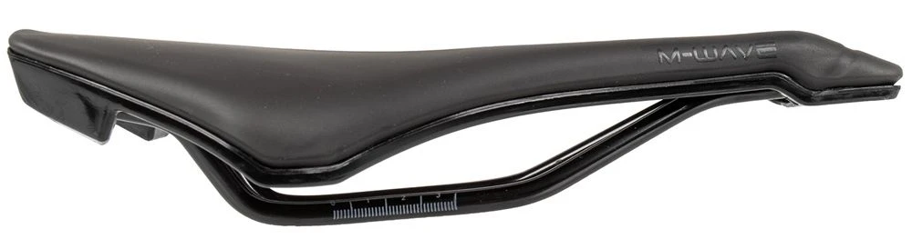 El Comp XI de M-Wave es un sillín para bicicleta de carretera y ofrece un alivio de la presión a través de un recorte en el centro.