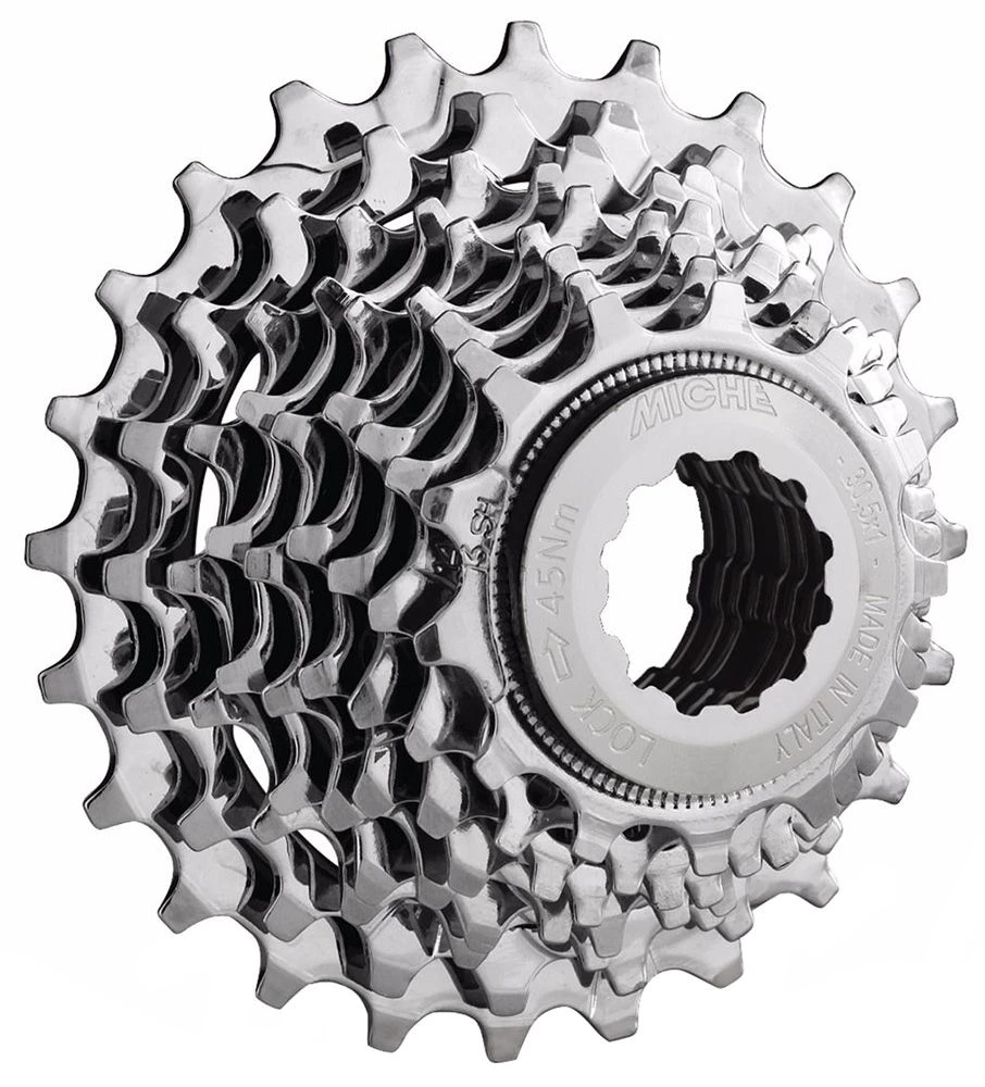 El casete de 9 velocidades de alta calidad de la serie Primato del fabricante italiano Miche es compatible con una rueda libre Shimano, así como con el cambio de 9 velocidades Shimano.