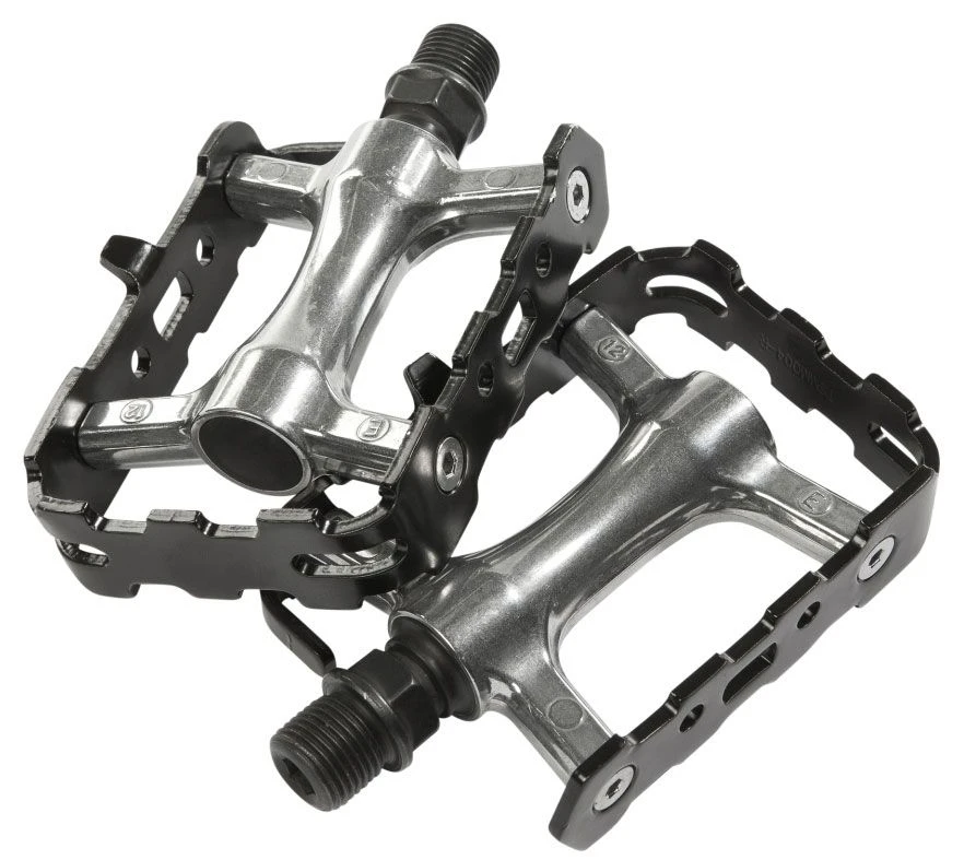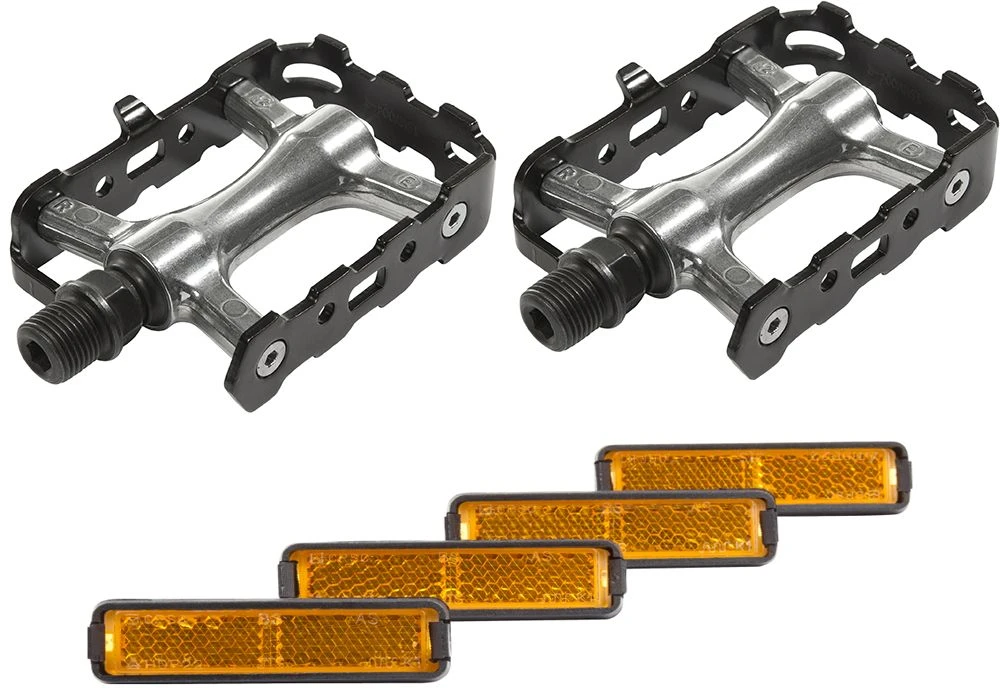 Pedales de aluminio de fácil agarre con eje de Cr-Mo y reflectores.