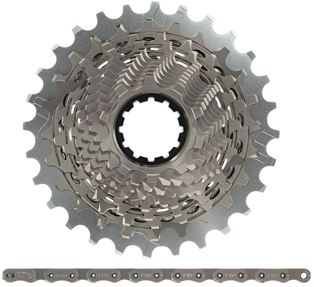 Kit de desgaste para la transmisión Sram de 12 velocidades que consiste en el casete RED PG-1290 con 10-33 dientes y la cadena RED con 114 eslabones.