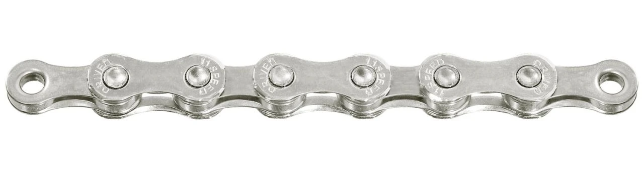 La cadena SunRace CN11A de 11 velocidades, especialmente resistente, para bicicletas de carretera y grava, tiene 126 eslabones y un cierre de cadena Easy-Link. Es compatible con transmisiones de 11 velocidades de Shimano, SRAM y Campagnolo.