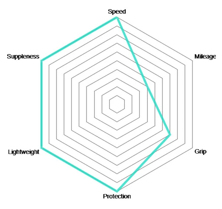 - Carcasa más ligera y banda de rodadura más fina para una velocidad máxima.
